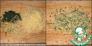 Пока картофель запекается, натереть пармезан на мелкой терке, измельчить чеснок и мелко нарезать зелень (у меня укроп). Перемешать.