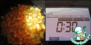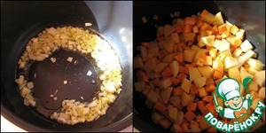 Спассеровать лук, затем добавить нарезанные кубиками картофель и морковь и немного их обжарить. -