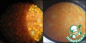 Влить к овощам бульон или воду. Количество воды добавляйте на свой вкус в зависимости от того, какая консистенция супа вам нужна.