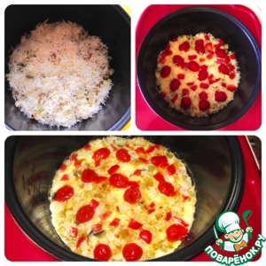 Сверху выложить оставшийся сыр, для украшения использовать половинки помидор черри. Готовить в режиме "Выпечка" 50 минут. Затем открыть крышку и слегка охладить запеканку.