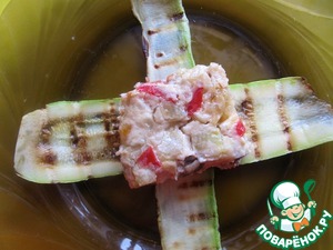 Приготовленную шарлотку нарежьте квадратами. На тарелку выложите два слайса кабачка крест-накрест, в центр положите кусочек шарлотки и заверните ее в кабачок. Украсьте помидорками черри, зеленью, подавайте с соусом.