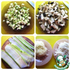 1 кабачок, баклажан нарезать кубиком. Второй кабачок нарезать слайсами толщиной около 5 мм. Сыр натереть на терке.