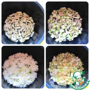 Чашу мультиварки смазать растительным маслом, на дно лучше застелить тефлоновый лист для выпечки (его тоже смазать). Выложить слоями: баклажаны, кабачки, посолить их по вкусу, затем выложить слой натертого сыра (смесь из 2-х видов) с сухим орегано, измельченный чеснок. Затем выложить оставшиеся овощи, обжаренный лук.