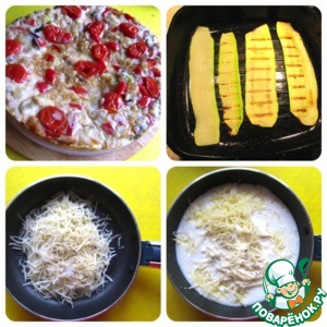 Пока остывает запеканка, обжарить слайсы кабачков на сковородке гриль, предварительно смазанной растительным маслом. Для приготовления соуса упарьте сливки с тертым пармезаном на медленном огне. Доведите соус до вашего вкуса солью и перцем.
