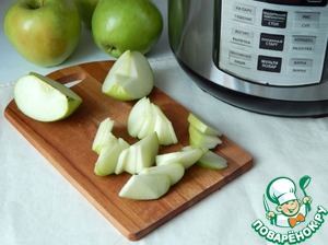 • Яблоки разрезать на 4 части и удалить сердцевину. Нарезать ломтиками.