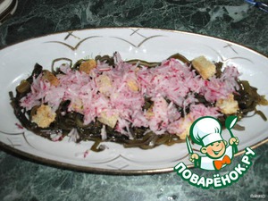 Салат готовится перед подачей на стол. Тогда сухарики получаются хрустящие.