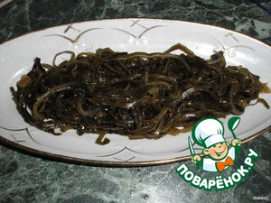 Иногда попадается песок на дне банки с морской капустой. Чтобы избежать попадания его в салат, воду из банки сливать не нужно. Можно достать морскую капусту вилочкой и выложить на дуршлаг, чтобы жидкость стекла.