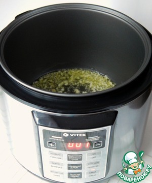 Чеснок очистить и раздавить. Мультиварку установить в режим "Жарка" на 5мин. Разогреть масло и обжарить в нем чеснок около минуты.
