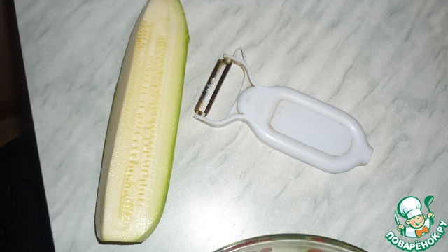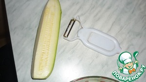 Для приготовления понадобиться овощечистка. Очищаем кабачок и морковь.