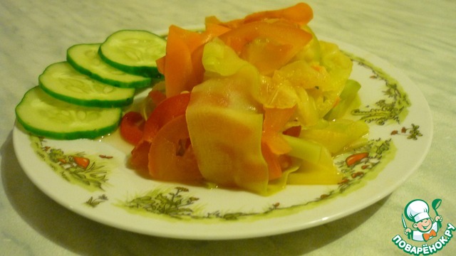 Теперь секрет приготовления! Все овощи нужно нарезать при помощи овощечистки. Помидор тонко нарезать ножом.