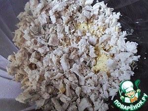 Тщательно перемешиваем сырную смесь с кусочками курицы.