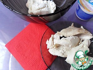 Куриное мясо запекаем или отвариваем, отделяем филе от костей. На мой взгляд, эта закуска получается гораздо вкуснее, если брать не белое мясо куриной грудки, а из разных частей курочки.