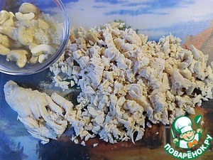 Мясо нарезаем ножом на мелкие кусочки, кешью измельчаем в крошку.