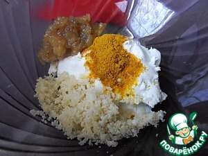 К сырно-йогуртовой смеси добавляем карри, молотые орешки и соус. Я использовала мангово-ананасовый чатни, который делаю постоянно, но, как я уже писала выше, можно без особой потери во вкусе заменить его на кисло-сладкий соус любой марки. Перемешиваем все компоненты.