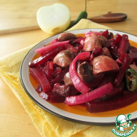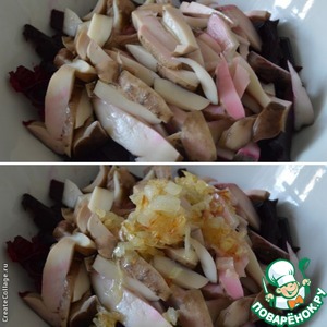В миске смешать свеклу, грибы, добавить жареный лук, пропущенный через пресс чеснок, соль, перец по вкусу.
