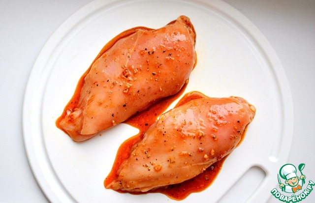 -В глубокую емкость положить куриную грудку, затем залить соляным раствором (2 ч. л. соли на 1 стакан воды). Раствор должен полностью покрывать куриную грудку. Отправить в холодильник минимум на 3 часа.