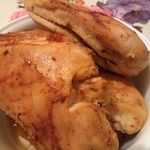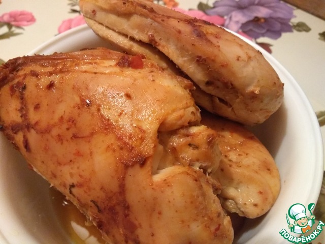-В небольшой миске смешать остальные ингредиенты (оливковое масло, соевый соус, паприку, мускатный орех, чеснок, мед), перемешать. После трех часов маринада, из грудки изъять кость, получится 2 филе, обмазать смесью пряностей