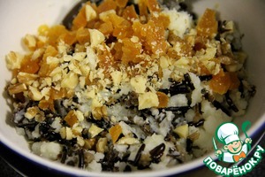 Курагу и грецкий орех мелко нарезаем и смешиваем со смесью риса и картофеля. Туда же добавляем соль и перец по вкусу.