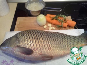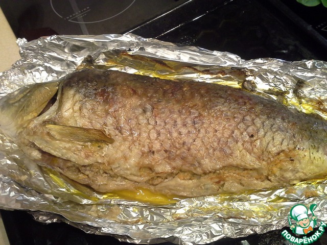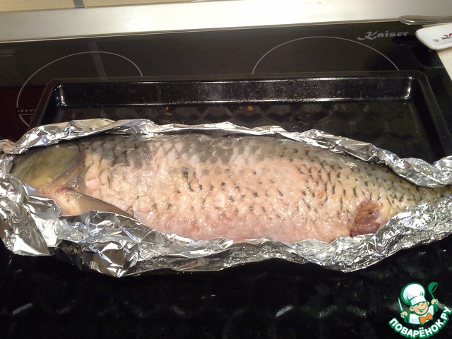 Фаршируем карпа. Если начинки много, то брюшко лучше зашить. Если нет, то можно просто рыбу уложить в фольгу и прижать края фольгой.