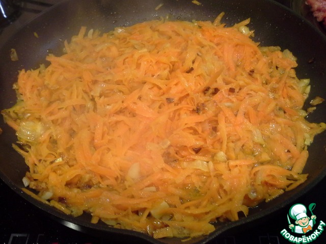Лук и чеснок мелко режем, морковь натираем на терке и все обжариваем на растительном масле.