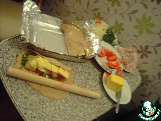 • Раскатываем средний блин (у меня 30 см.) укладываем в него рыбку, помидорчики ; обсыпаем зеленью и солью ; сверху сыр (можно по моему примеру или через тёрку). Смазываем форму маслом, полученные свитки помещаем в форму.