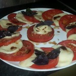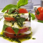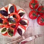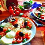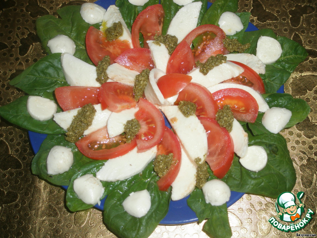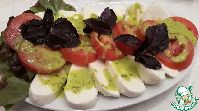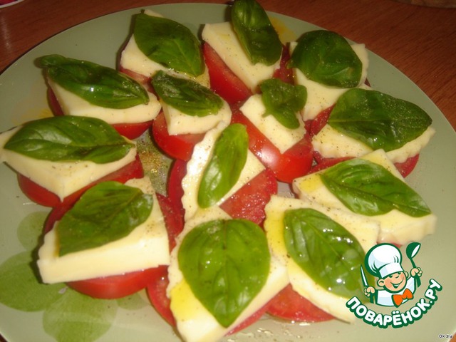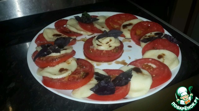 Капрезе - это традиционная итальянская легкая закуска. Название эта закуска получила от острова Капри. Благодаря красно-бело-зеленому цвету, повторяющему цвета итальянского флага, капрезе стало одним из национальных блюд Италии. В традиционном рецепте должна использоваться моцарелла из молока черных буйволиц, лучший сорт томатов для капрезе — «Бычье сердце», а оливковое масло должно быть холодного отжима. Не знаю, какое молоко используют для производства отечественной моцареллы, но даже без такого фанатизма закуска что надо! :)