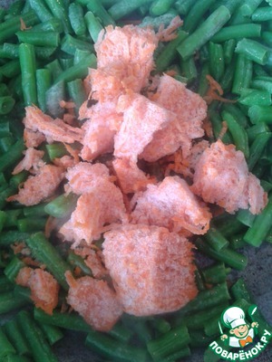Когда она разморозилась (если была замороженная), и немного поджарилась, добавляем морковь. Можно её на тёрке, можно порезать. Кому как больше нравится. У меня она заморожена в брикете.