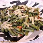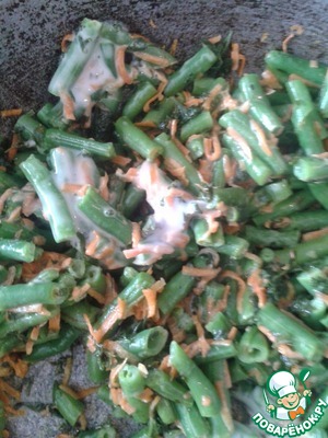 Потом наливаем немного водички в сковородку и закрываем крышкой, чтобы фасолька чуточку поварилась, минут 10. До полной мягкости. А потом добавляем сыр или сметану (для вегетарианцев сыр должен быть без животного сычуга), по вкусу добавляем соль и букет приправ. Ждём, когда сыр расплавится, и подаём к столу.