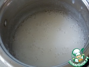 Воду довести до кипения, положить промытый рис. Варить 20 - 25 мин. на маленьком огне под крышкой. Рис должен сильно развариться. Снять с огня и тщательно пропюрировать блендором.