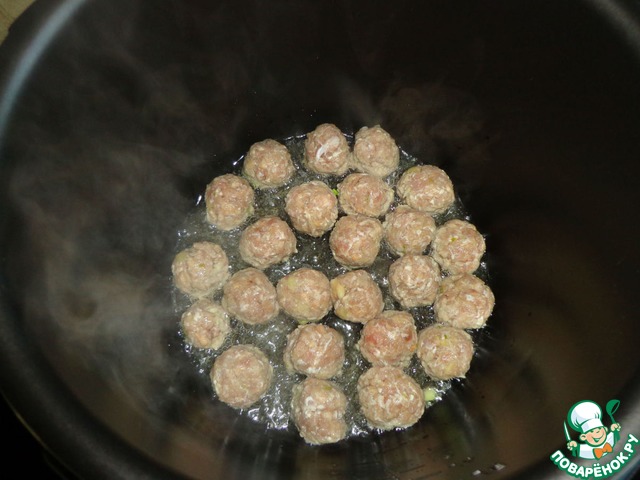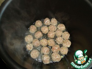 Влить масло в чашу мультиварки и обжарить в режиме "Meat" фрикадельки. Фрикадельки вытащить