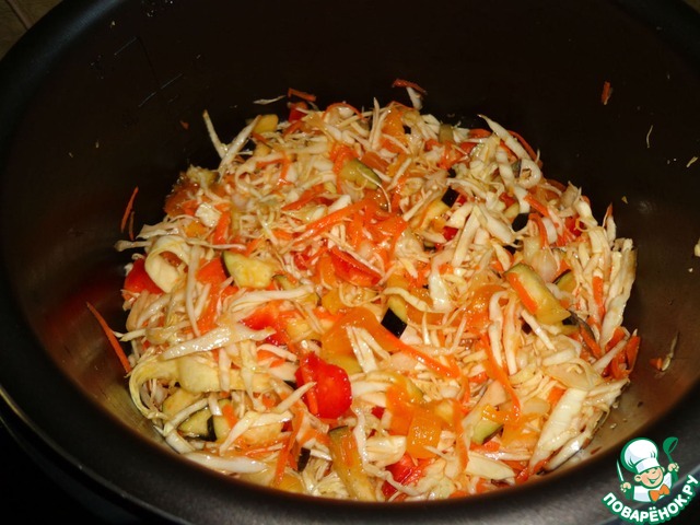 В оставшееся масло выложить овощную смесь, добавить томатную пасту, воды, закрыть крышкой и в режиме "cake" тушить 20 минут