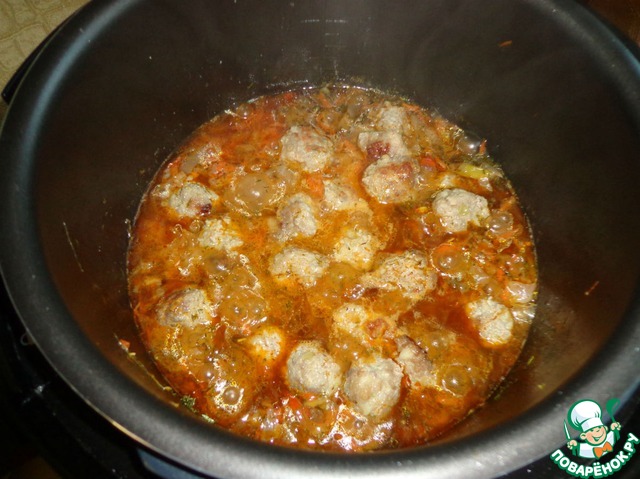 Затем добавить обжаренные фрикадельки и при закрытой крышке в этом же режиме потушить еще минут 8-10. В конце приготовления добавить порезанный укроп