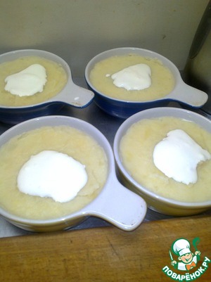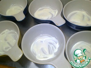 Майонез смешиваем с сырым яйцом, взбиваем вилкой до однородной массы. На дно тарелок для запекания кладем по столовой ложке майонезно-яичной массы и распределяем по всей поверхности.