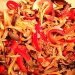 Перец и морковь нарезать соломкой, лук - тонкими полукольцами, чеснок выдавить через пресс, зелень измельчить.