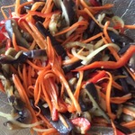 Баклажаны помыть, не очищая от кожи нарезать соломкой. Посолить (1-2 ст. л.), перемешать и оставить в соли на 8!!! часов.