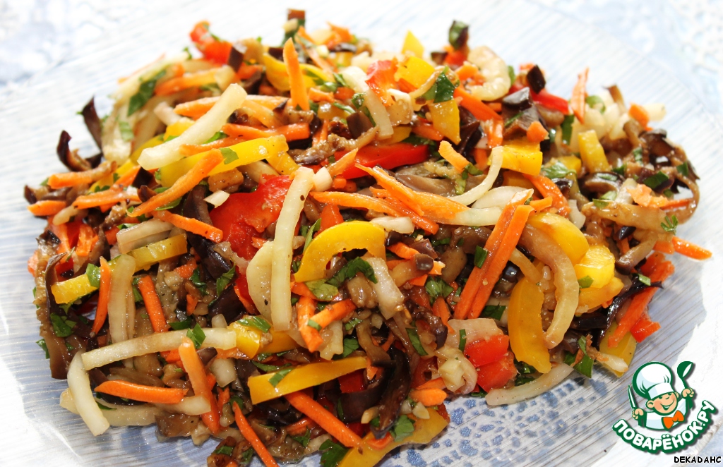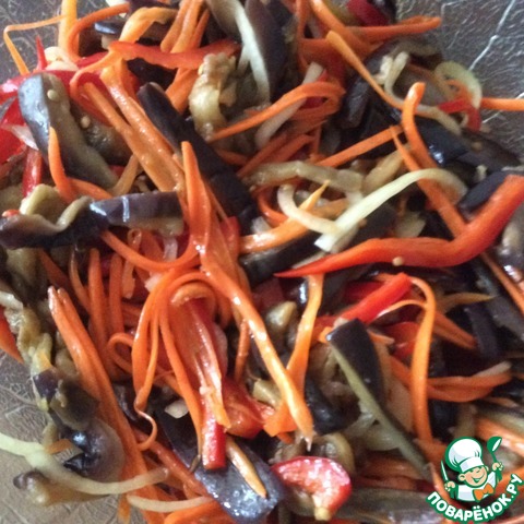 Овощи соединить с баклажанами и зеленью, заправить уксусом, посолить, поперчить и оставить на холоде на 12!!! часов, чем дольше, тем вкуснее.