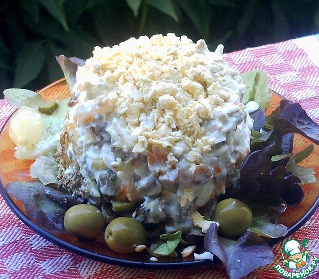 Сверху посыпать желтком, тертым на мелкой терке. Оставить немного настояться, украсить и подавать. Приятного аппетита!