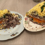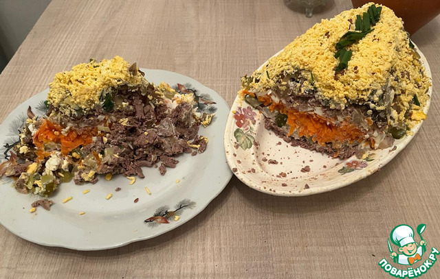 Укладывать слоями в прямоугольное или овальное блюдо с высокими бортиками в следующем порядке: