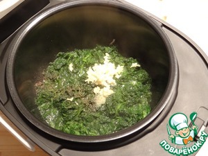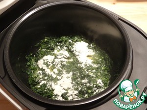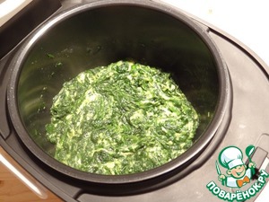 Эти лепешки я с легкостью приготовила в замечательной мультиварке Vitek VT-4205 ВК. Мультиварку включаю на программу "Поджаривание". В чашу мультиварки наливаю растительное масло, добавляю замороженный шпинат. Даю выпариться большей части жидкости.