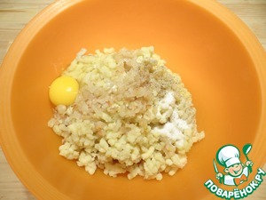 К прокрученному на мясорубке картофелю добавляю обжаренный лук, яйцо, соль, черный молотый перец.