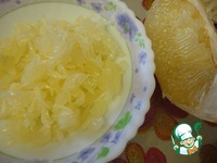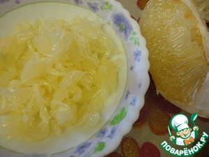Помело очистить, удалить все сегменты прожилок и пленочек. Разломать мякоть на небольшие кусочки.