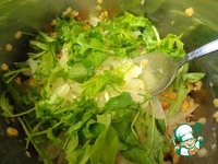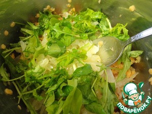 Рукколу вымыть, обсушить на бумажном полотенце и измельчить руками. Добавить рукколу, заправить оливковым маслом и сразу же подавать к столу. Хранению этот салат не подлежит!