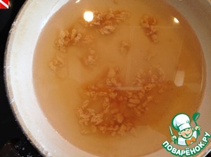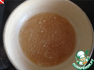 Сахарную пудру ставим на средний огонь и, непрерывно помешивая, доводим до светло-коричневого цвета.. На фото видно, что она нагревается неравномерно, сбивается в кусочки - ничего страшного.