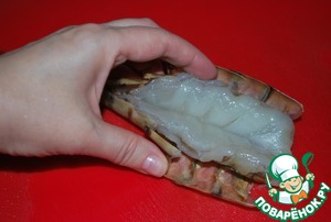 3. Отделить голову. Ножницами разрезать панцирь на спинке до хвостика.