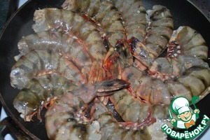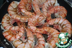 15. Берем большую сковороду, сильно разогреваем растительное масло и выкладываем наши креветки. Жарим 2 минуты.