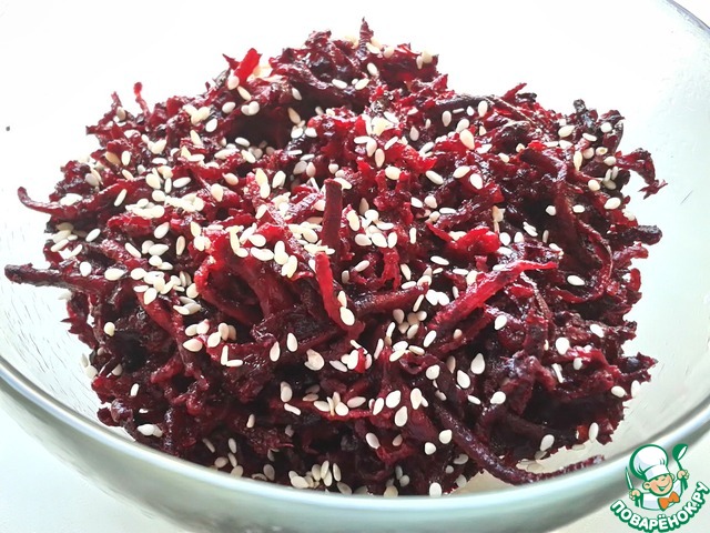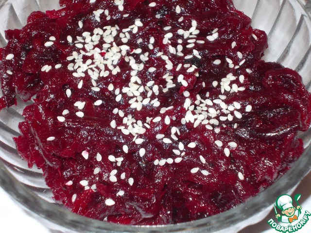 Рецепт для поста. Он очень простой, без претензии на изысканность, но тем не менее свекла получается очень вкусной. Сейчас, когда по весне мы все страдаем от нехватки витаминов, такой салат будет весьма кстати. Кунжут придает свекле пикантный, я бы сказала, восточный вкус. Да и времени на приготовление тратится от силы минут 5.