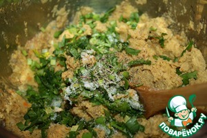 Добавить чеснок, зелень, черный перец, соль и тимьян, смесь из семян льна с водой
