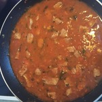 3) После обжаривания мяса добавьте к нему воду (1,5 стакана), кетчуп и томатную пасту, соль и все специи. Всё старательно и бережно перемешиваем! Советую еще немного "поскоблить" по дну посуды, в которой готовится гуляш: так мы обязательно соберем со дня "золотинки", оставшиеся там от мяса и лука.