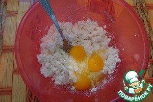 Теперь начинку: яйца добавить к творогу и растереть вилкой, чтобы не было больших комков