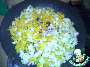 Лук и сладкий перец нарезать кубиком и обжарить на масле до готовности